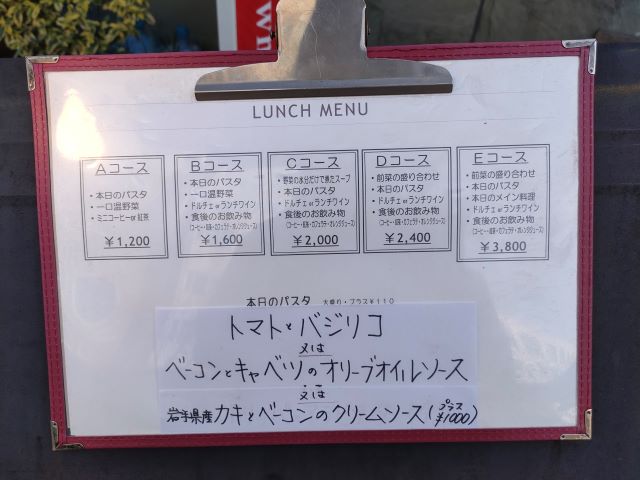 AコースからEコースまで、本日のパスタをメインに前菜や一口温野菜、ドリンクなどで構成されています。
