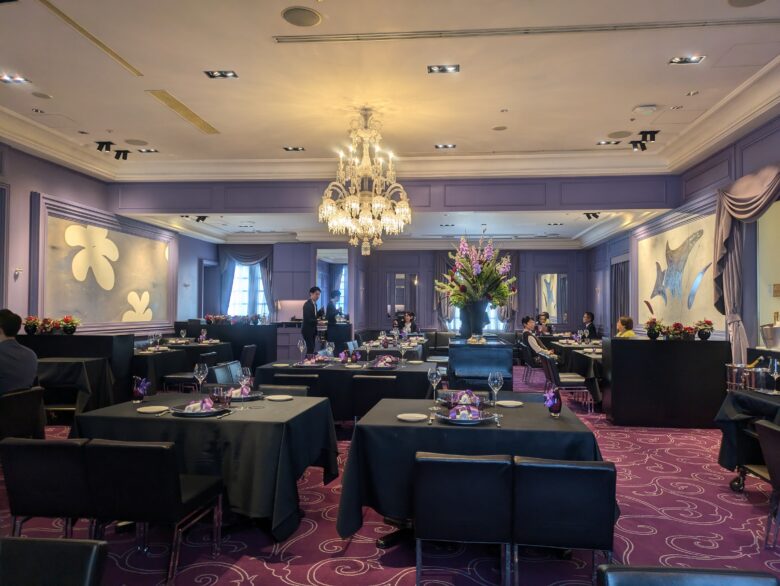 ターブルの中は、紫を基調としたシックで落ち着いた大人の空間で、天井には豪華なシャンデリアがありました。