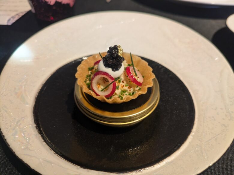 タルトの料理は外側がサクサクで、キャビアが贅沢に使われていました。