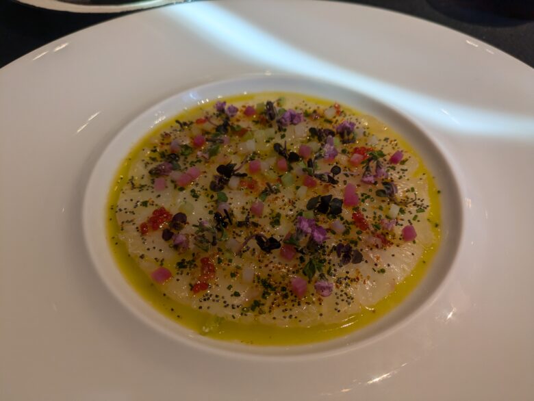 カルパッチョは、白身魚の身がプリプリで新鮮で、細かく刻んだ野菜との相性も抜群でした。