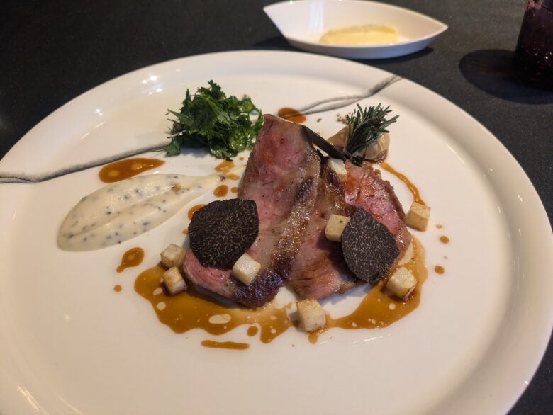 - 塚原牧場 “梅山豚” のロティ 薫り高い黒トリュフと根セロリのクーリを添えて